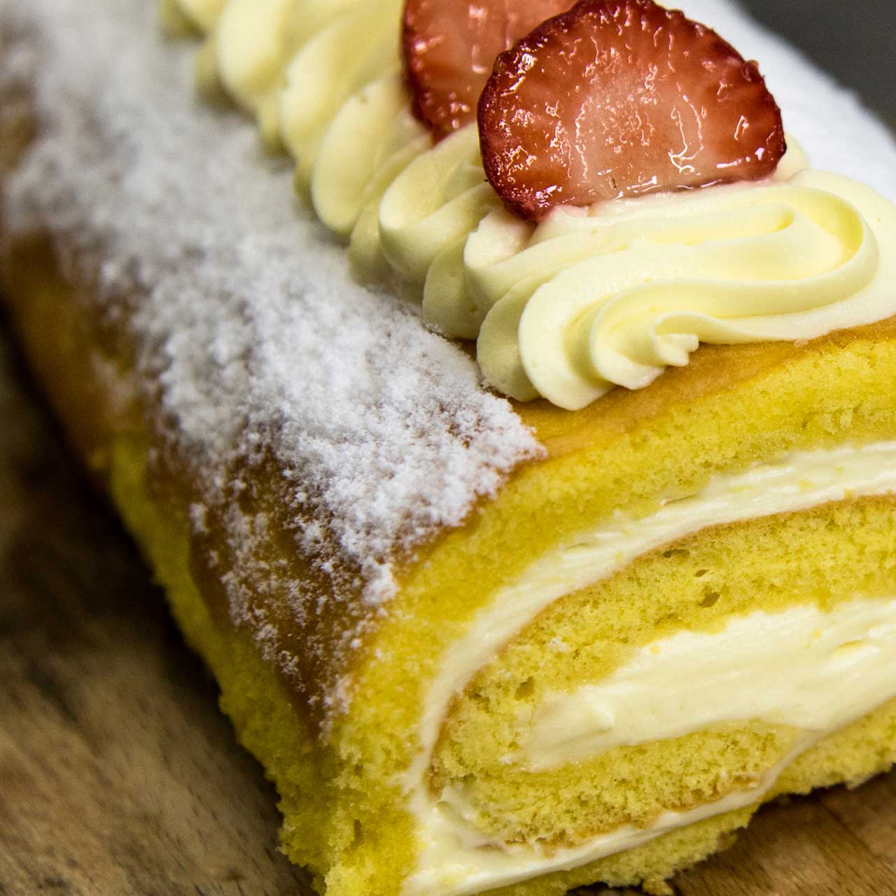 Farcitura alla crema chantilly, fragole, aromi e zucchero a velo.